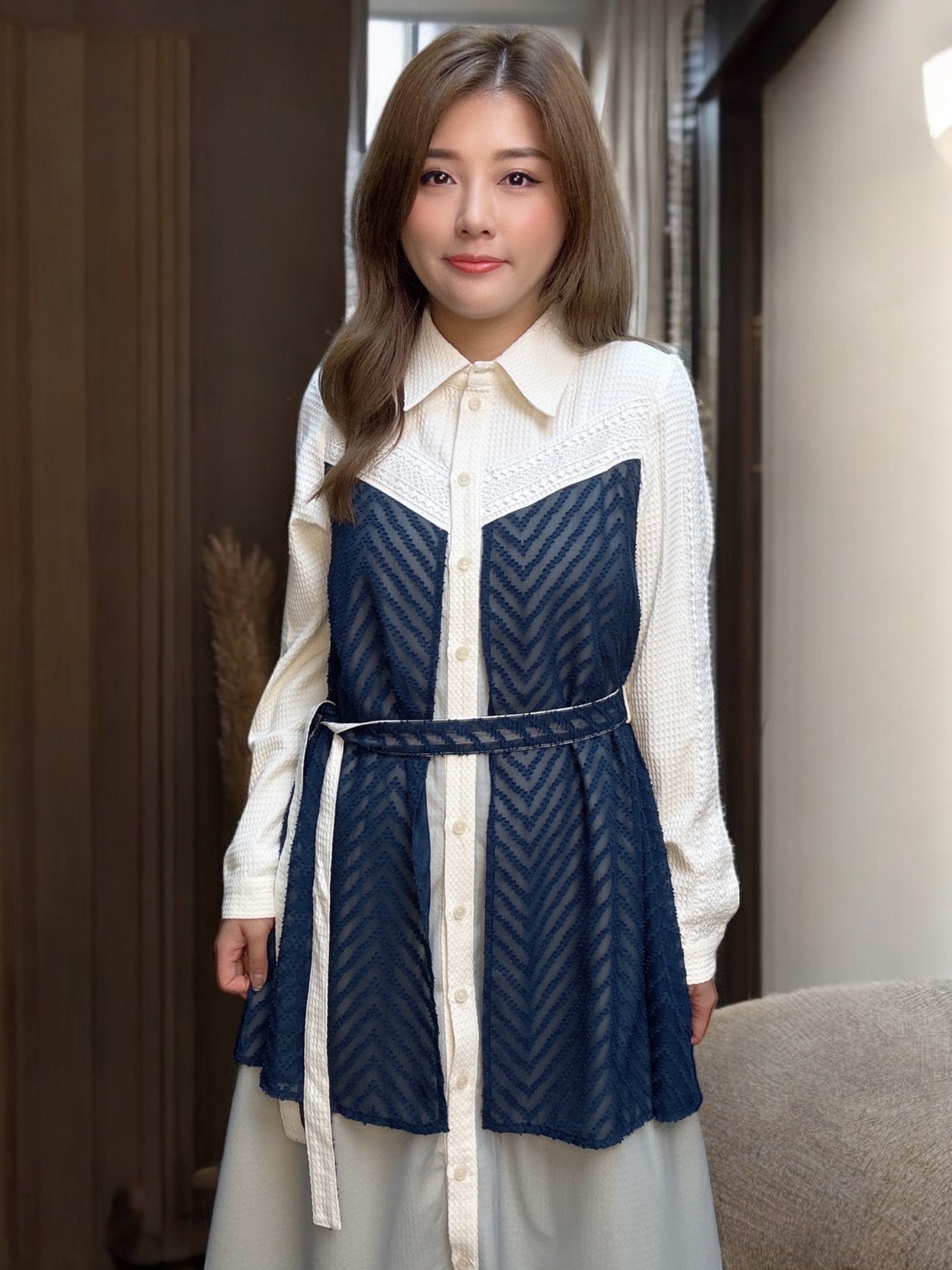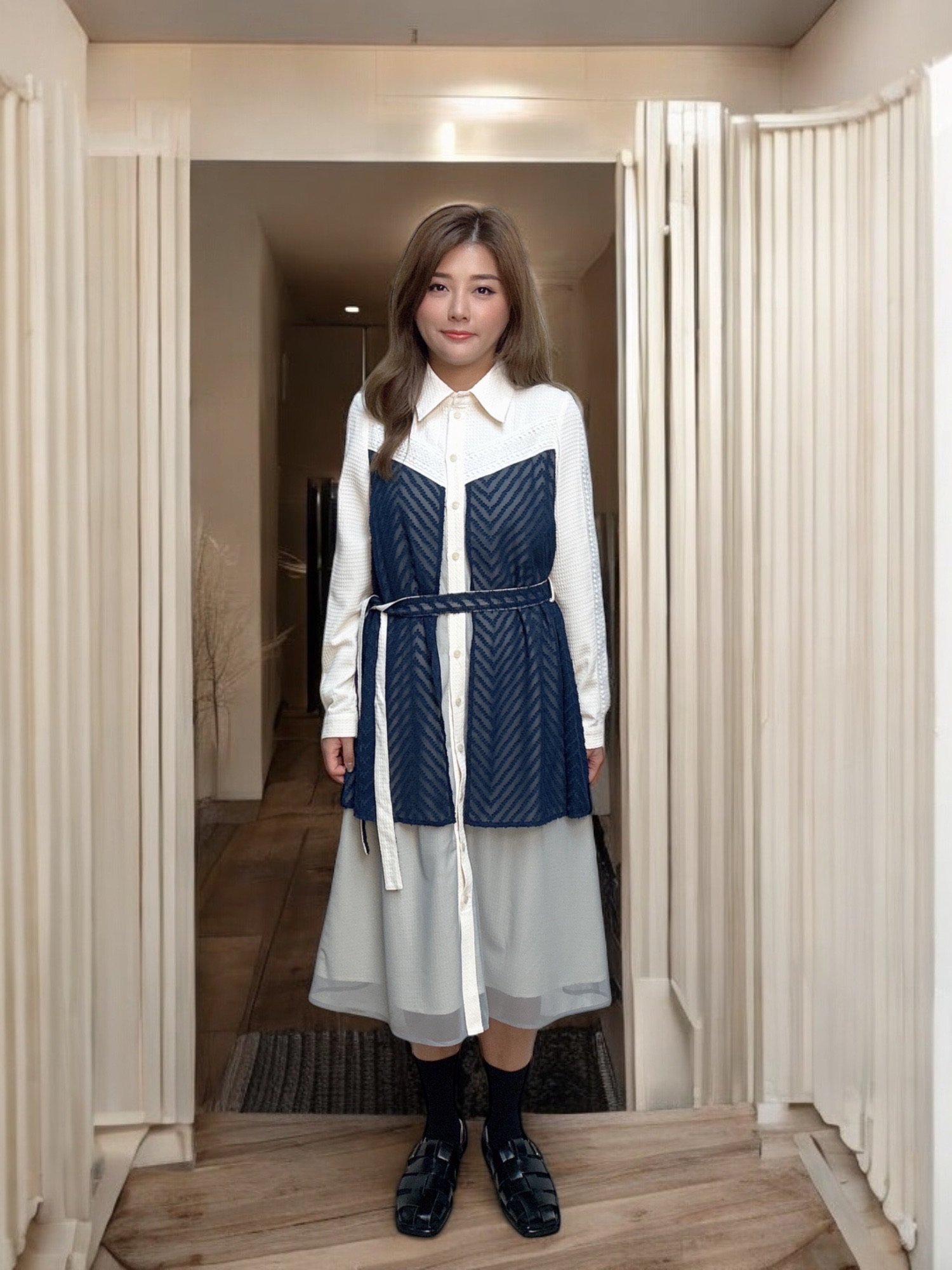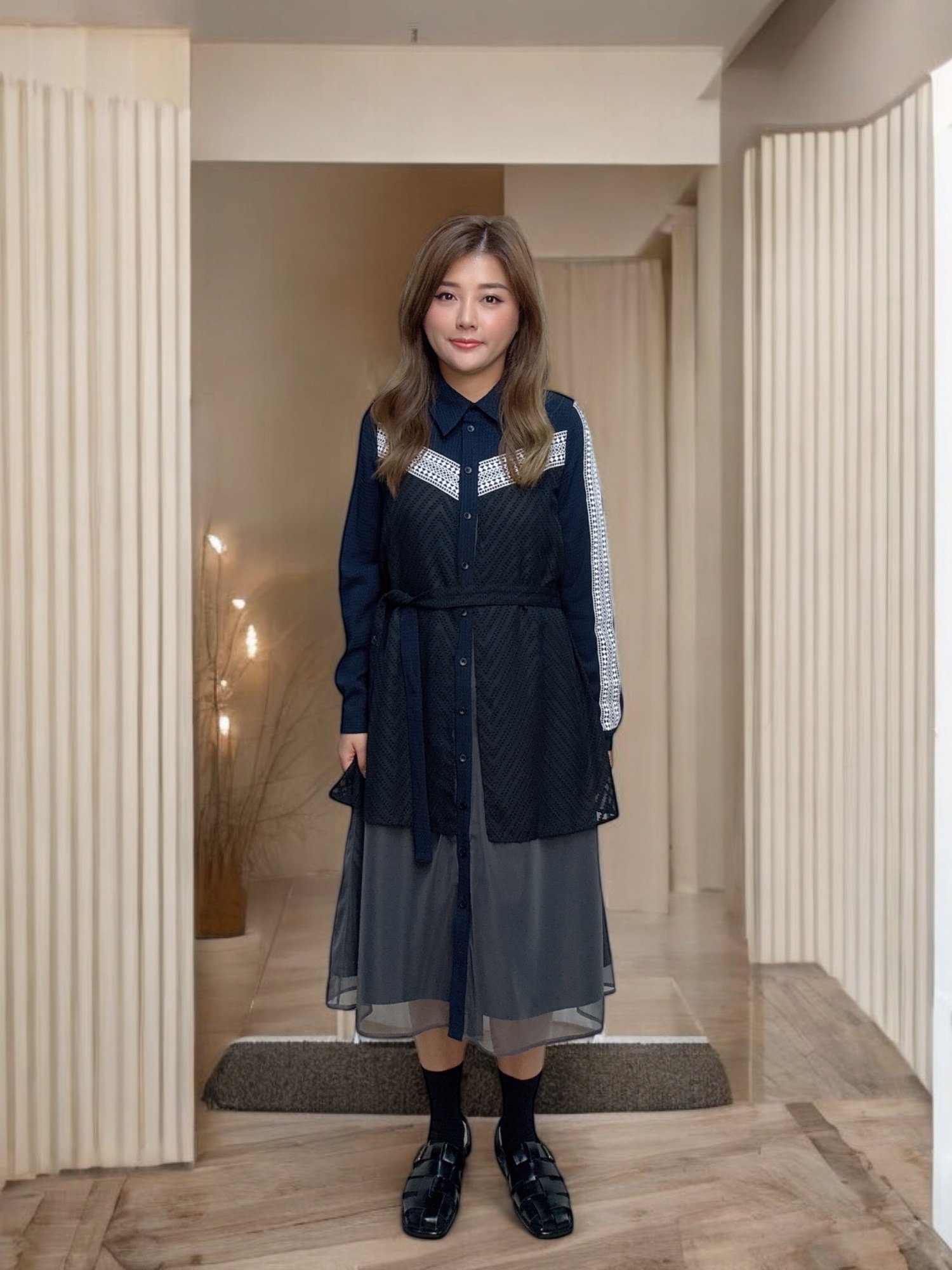 103502 BS459 自家系列 格紋提花布下拼雪紡連身裙