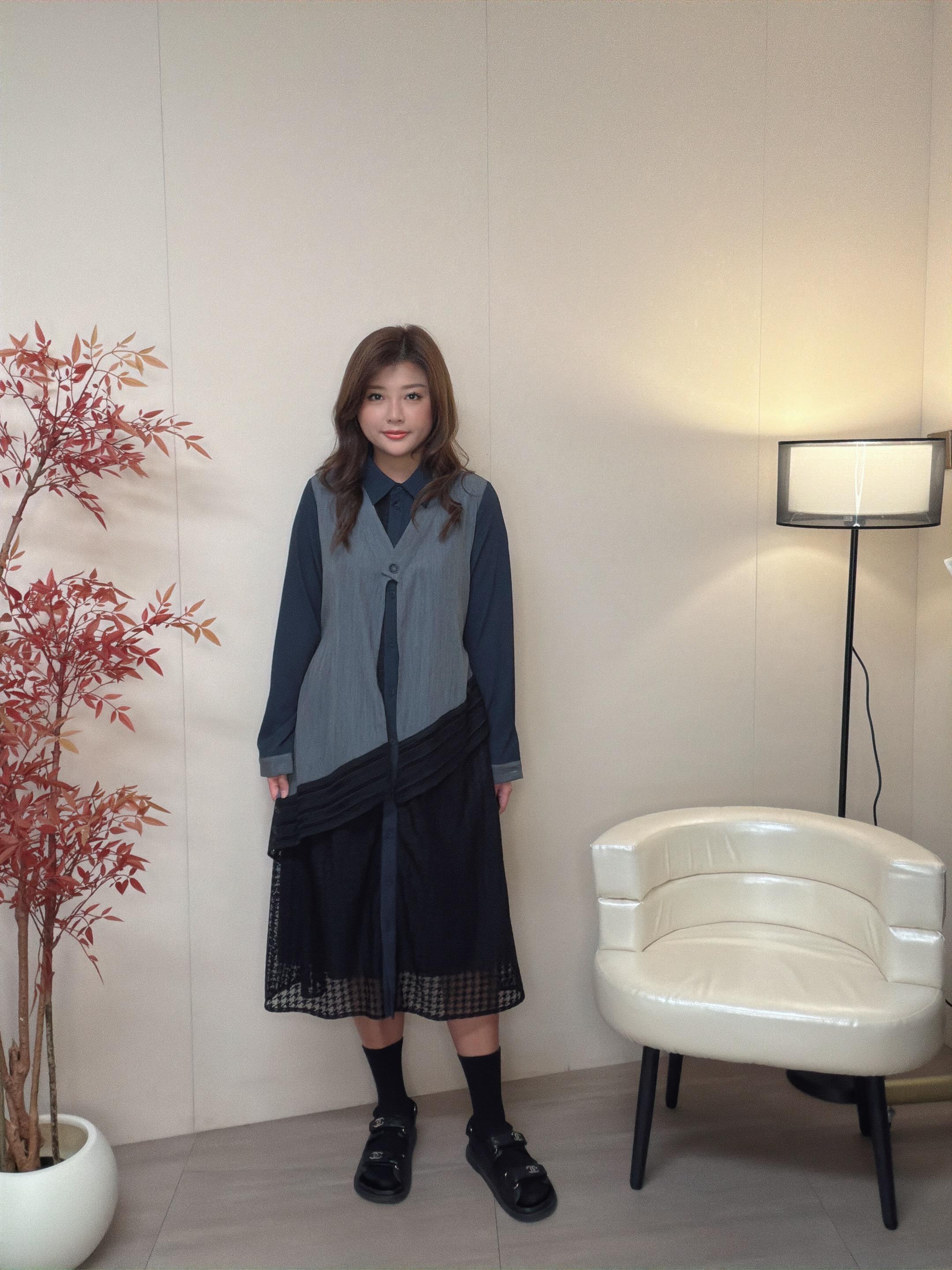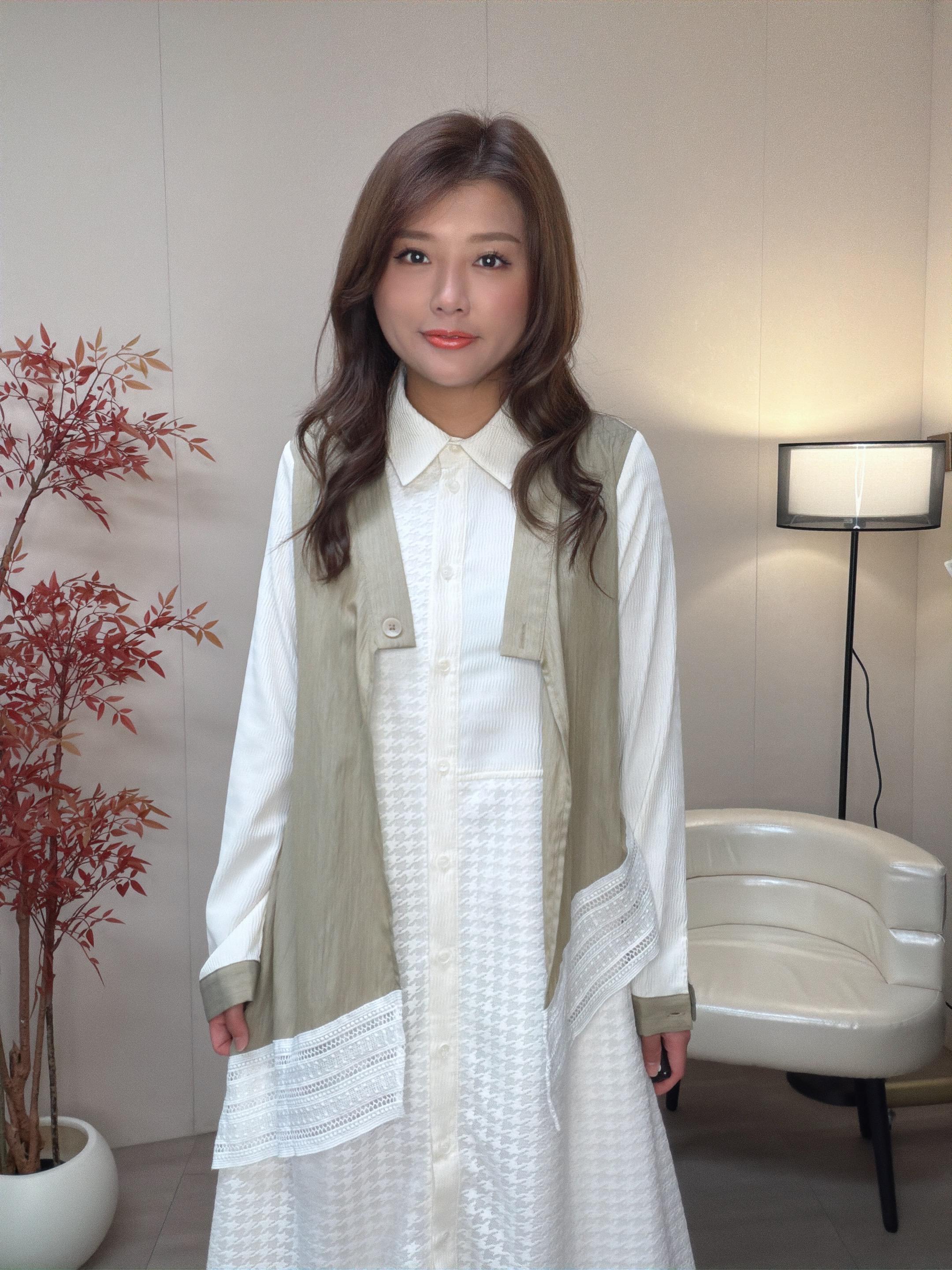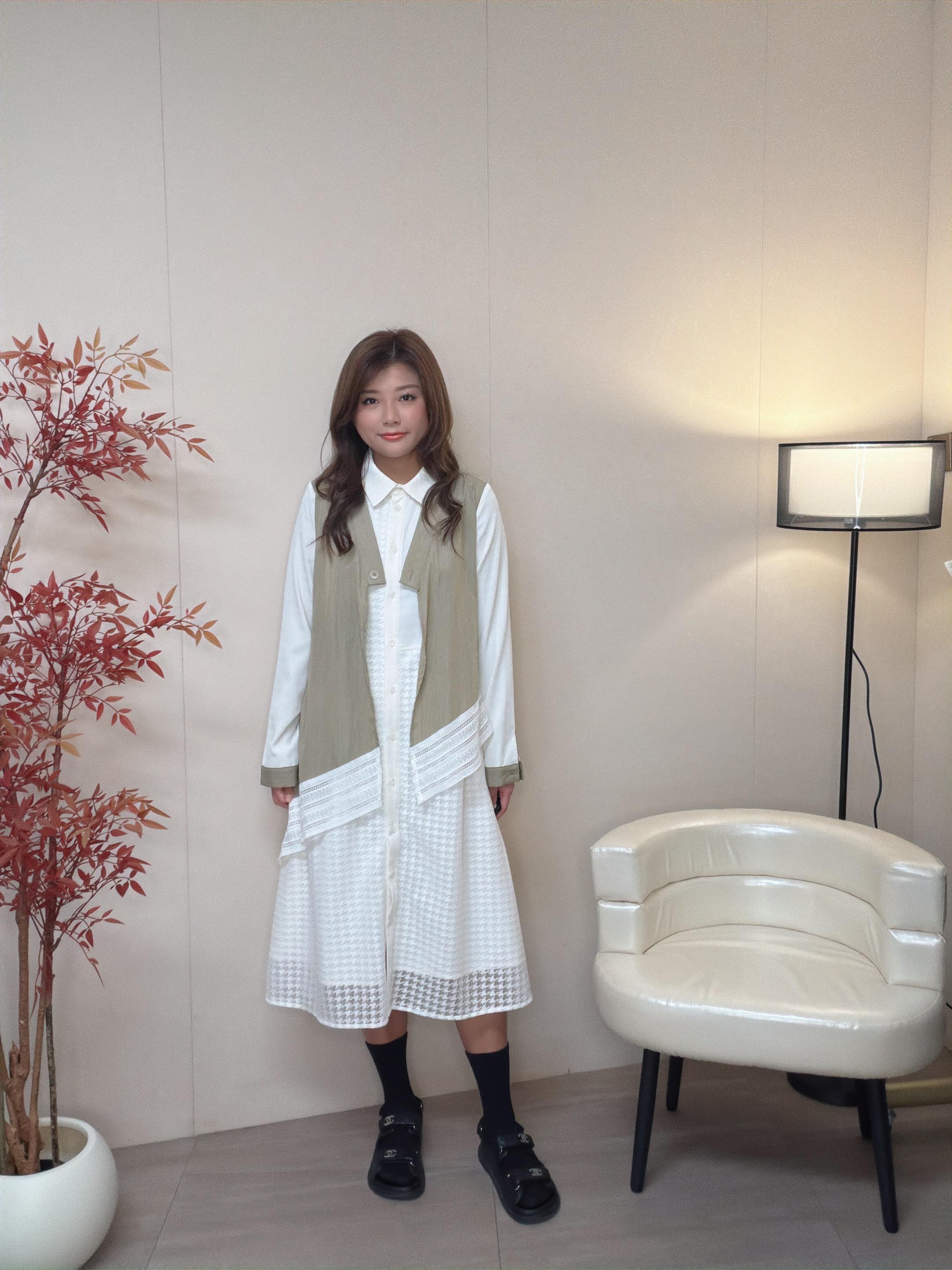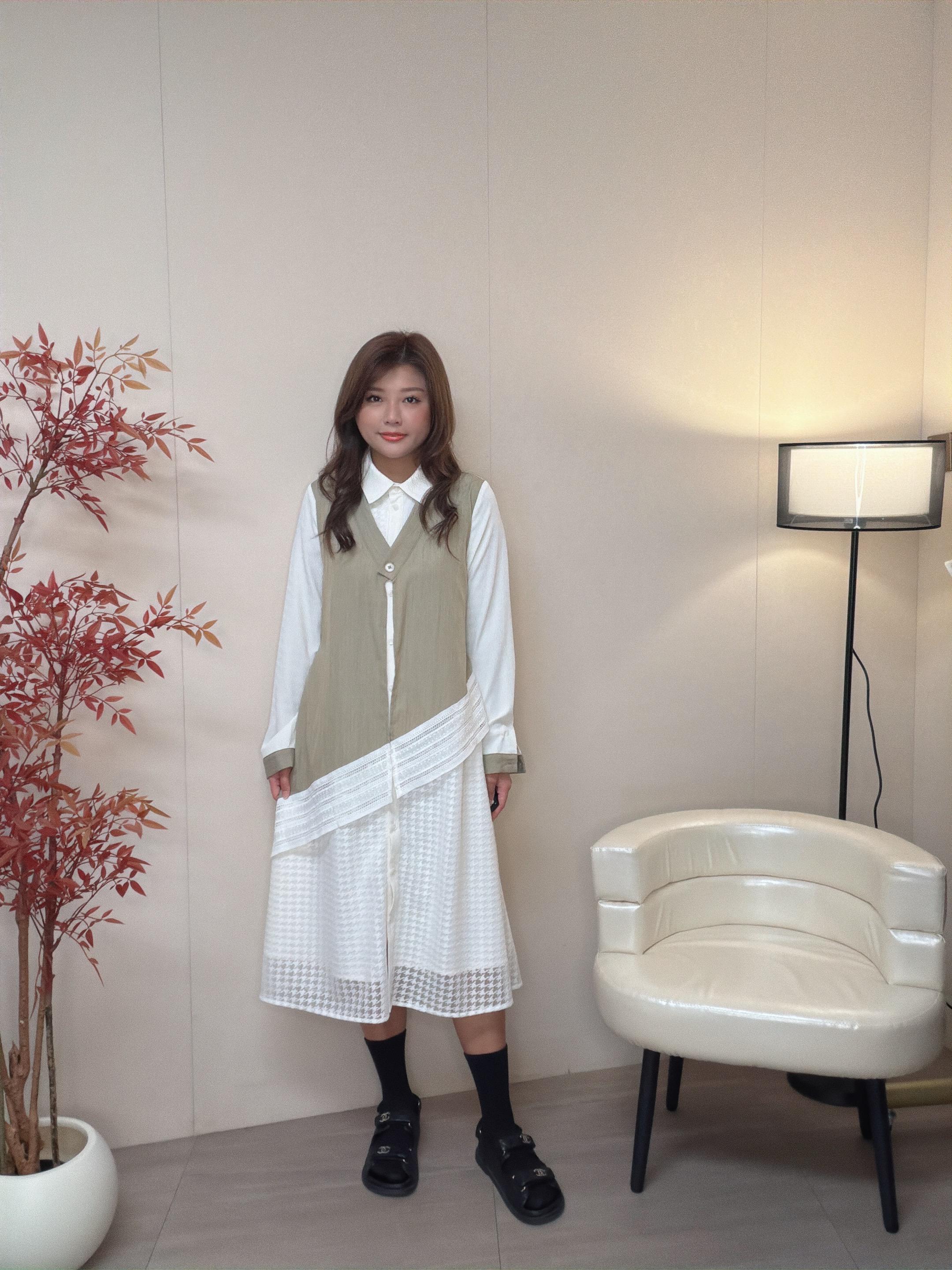 103723 BS551 自家系列 仿兩件斜粗邊織花條紋蕾絲花邊背心外套 內千鳥格紋連身裙
