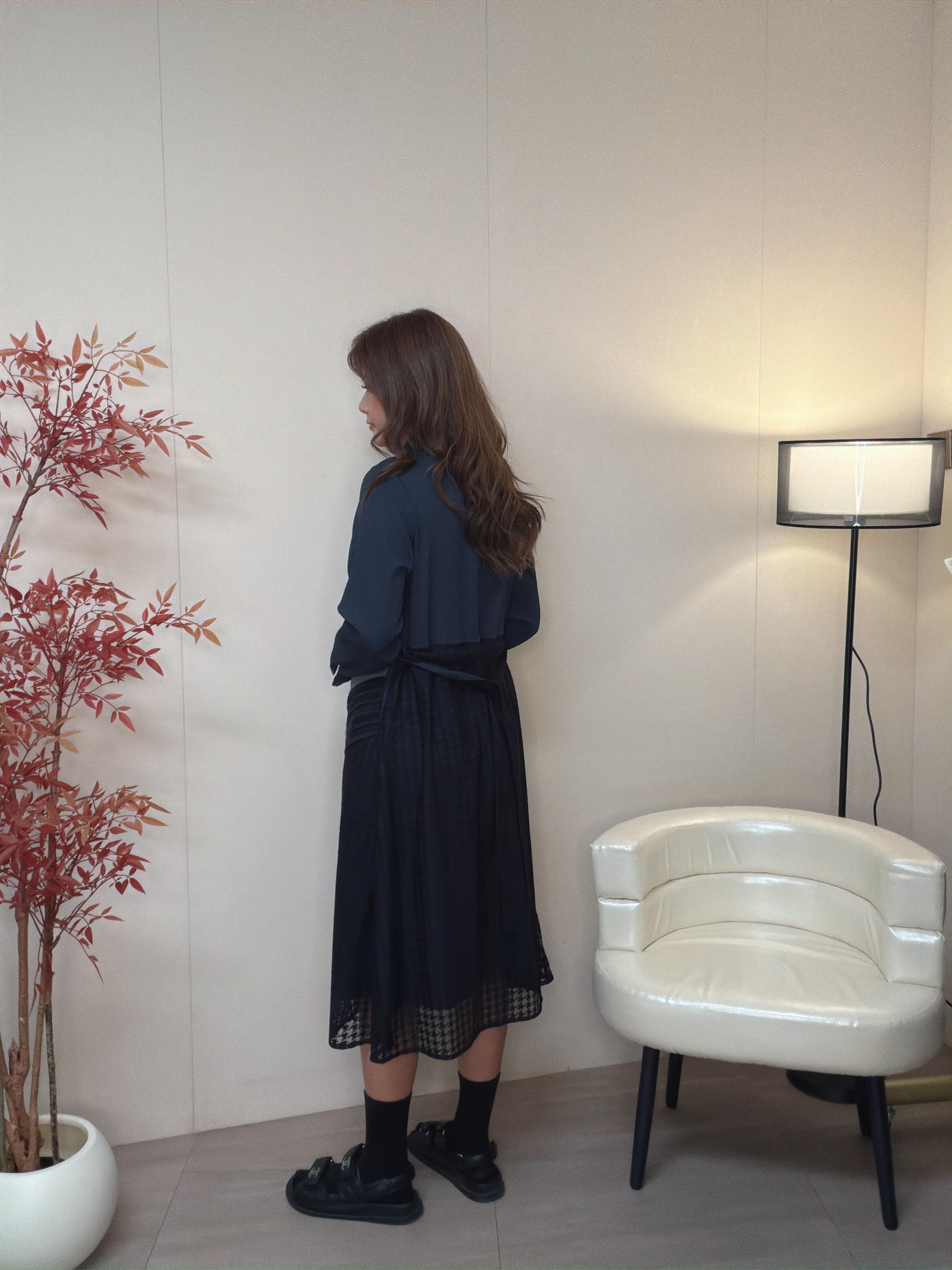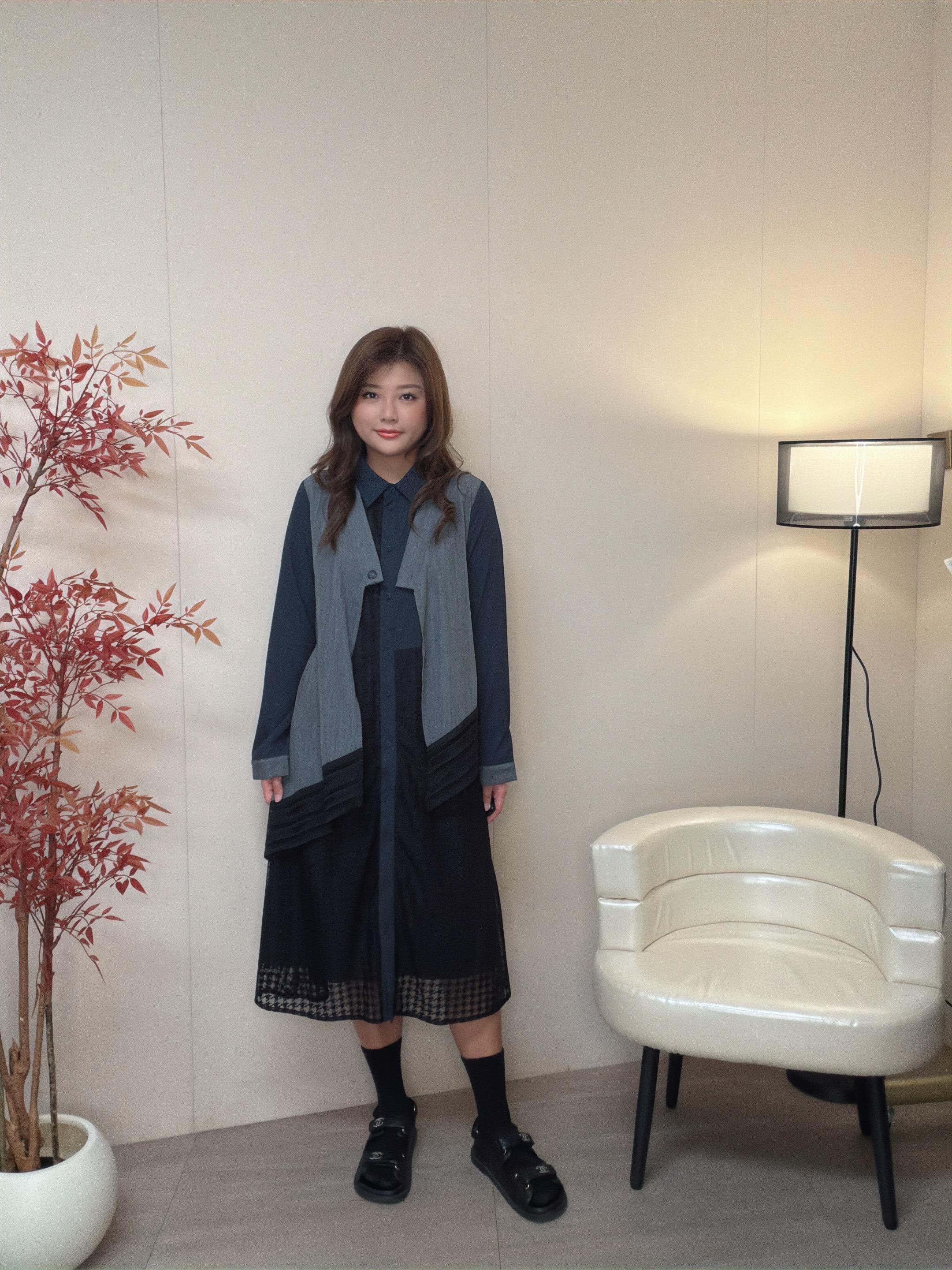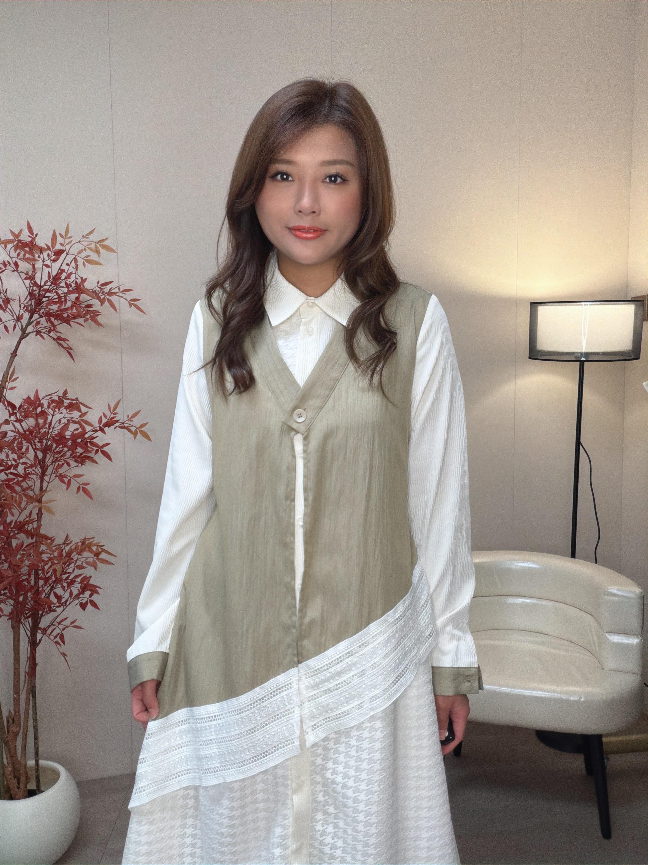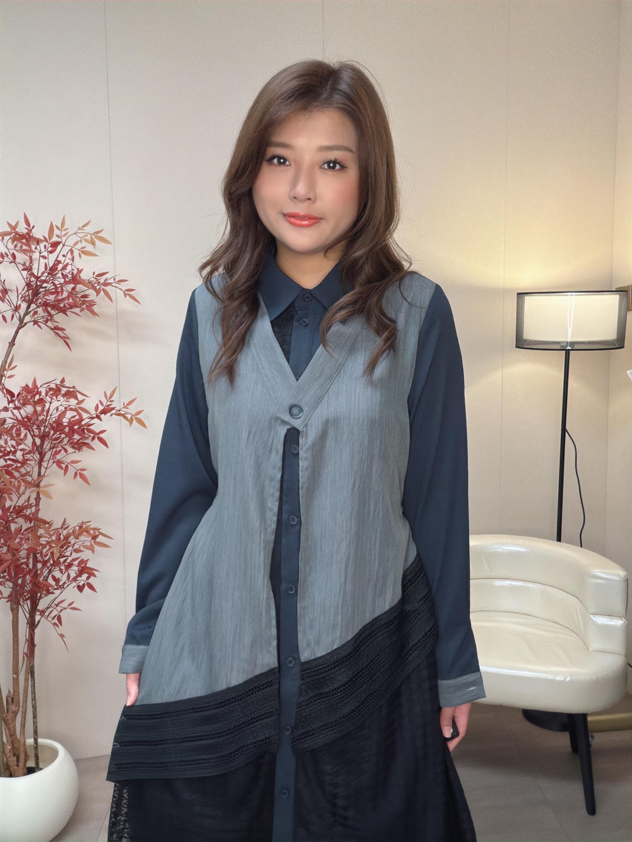 103723 BS551 自家系列 仿兩件斜粗邊織花條紋蕾絲花邊背心外套 內千鳥格紋連身裙